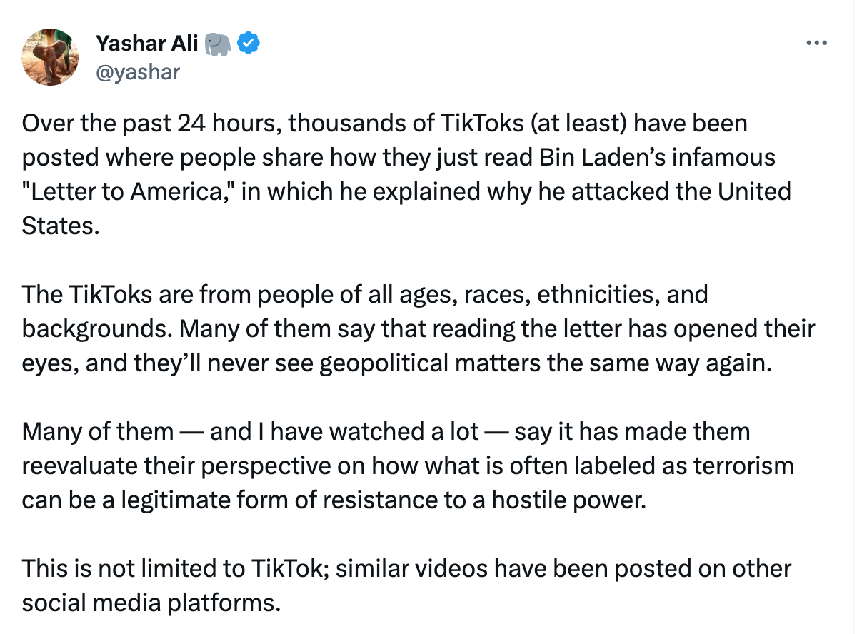 The popularity of Osama bin Laden’s letter on TikTok is based on childish notions of evil. Because anyone can argue their case.
