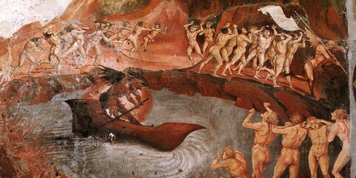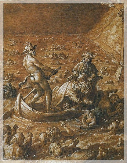 After the gates with the inscription, we come to a river—the Acheron—where Charon the ferryman takes the souls of the damned to the opposite bank on his boat. Here we find the first of the nine circles.